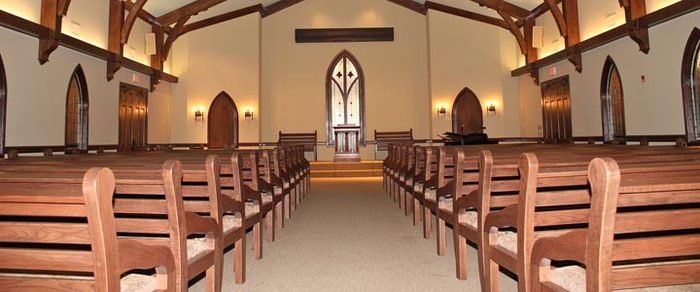 The result of this research was a funeral home designed so that families could celebrate the life of a loved one in a warm, pleasant, and comfortable setting. The furniture is a combination of antique and modern, elegant pieces. The chapel features old-time slat-back benches with covered seats, stained glass windows, and a baby grand piano.